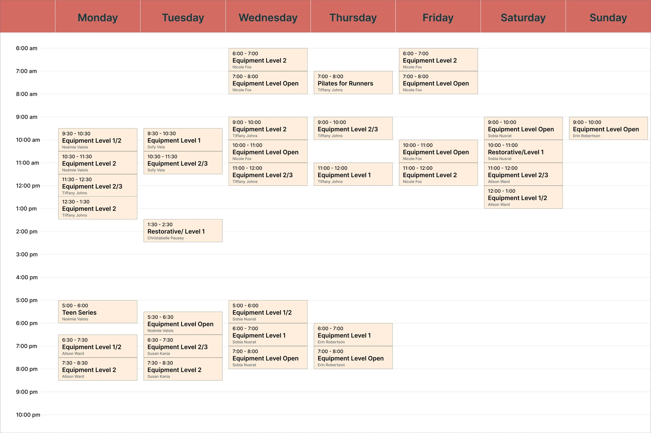 All of our group classes are on pilates equipment, specifically the reformer and tower, and often incorporate additional props. We have maximum 6 students in each class to give you the specific attention required to achieve your best performance.